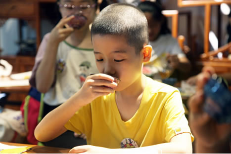 孩子们学着茶艺老师的泡茶手法,为小伙伴倒茶,领略整个品茶过程的美好意境。
